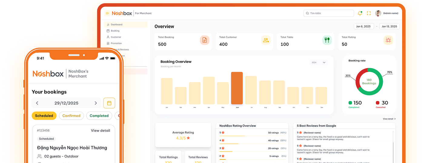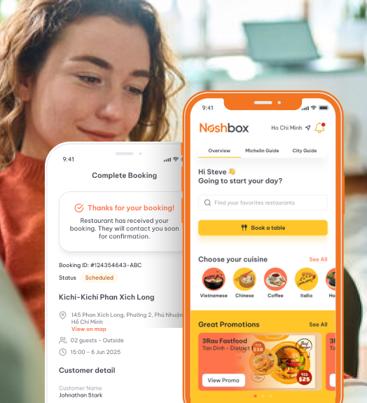 Noshbox mang đến nền tảng đặt bàn nhanh chóng & quản lý thông minh giúp nhà hàng tối ưu doanh thu, đồng thời đem lại trải nghiệm đặt chỗ nhanh chóng, ưu đãi độc quyền cho người dùng.